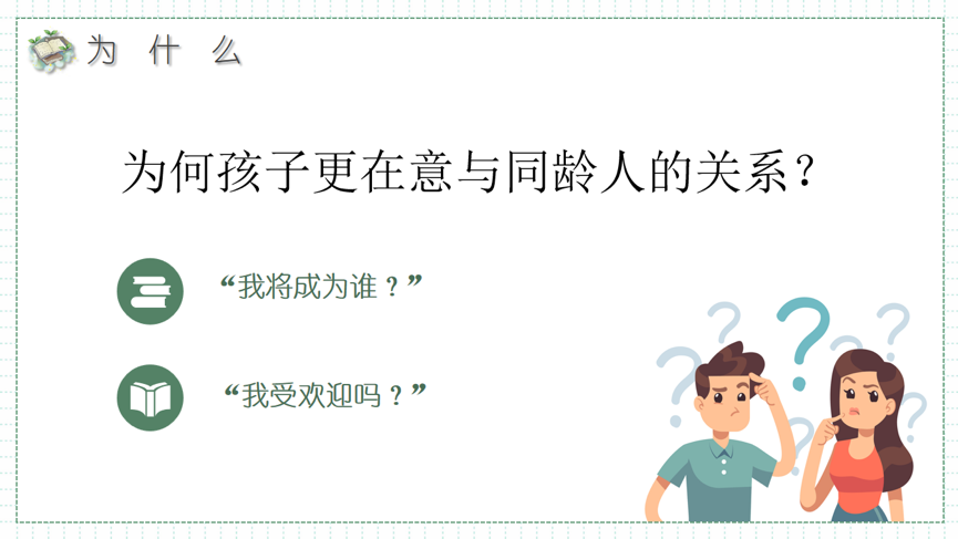 在直播之初,主讲老师指出在青春期的孩子看来,与亲子关系相比,同伴关系对他们来说越来越重要。青春期的孩子在同伴关系中,有两个很关心的问题:我将成为谁、我受欢迎吗。如果你对孩子的同伴关系感到不满,不妨先从孩子的角度来考虑这两个问题,或许能更好地理解到他。