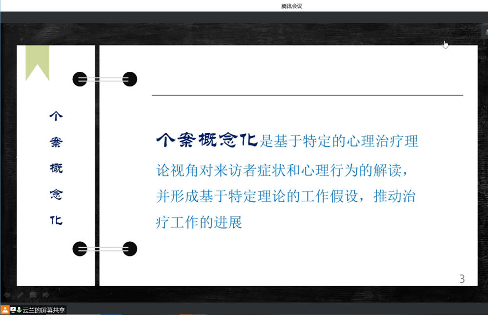 在督导开始之前,团体成员共同温习了假期中关于“个案概念化”的培训知识内容,厘清了个案辅导的思绪,以便薛老师在我们专业提升方面给予指导。