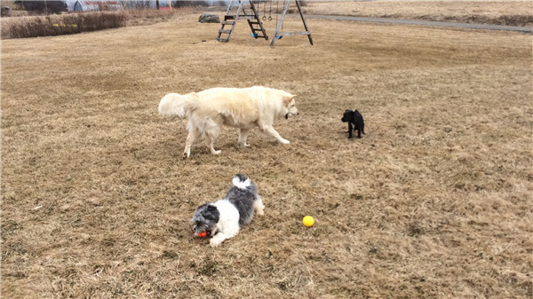 回到家,我的弟弟山姆带我跟狗一起玩,他们家的三只狗都会玩球,但我最喜欢和波比一起玩,因为我最喜欢它,它那一身洁白的长毛是那样的美丽和惹人喜爱,我把一个球扔出去,她就会飞快地跑去把它捡回来,可却总不还给我们。