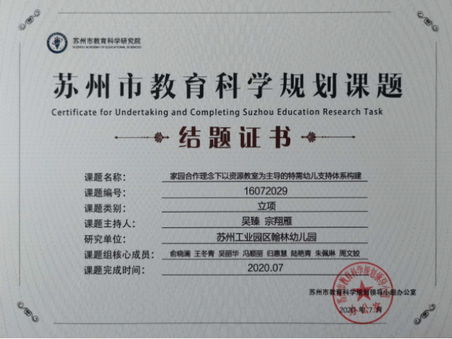 幼儿园成功申报并顺利结题了苏州市教育科学“十三五”规划家庭教育及课程建设研究专项课题《家园合作理念下以资源教室为主导的特需幼儿支持体系构建》,探寻了一条行之有效的资源教室运行模式,逐步形成一个由家长、制度、人员、设施和课程等共同组成的有机整体。幼儿园逐步打造了一个室场(资源教室)、实现两个转变(教师观念、行为)、形成三方合作(幼儿园、家长、医疗机构)、完善四套材料(基本信息记录表、个别化教育指导计划表、活动观察记录表、家园沟通记录表、建立“一生一案”个人档案)。