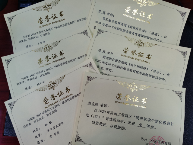 在苏州工业园区2020年融合教育专项督导活动中,翰林幼儿园顺利通过督导考核,获评“融合教育示范学校”;在“融合教育优秀课评比”、“个别化教育计划(IEP)评比”“融合教育最美教师”故事征集评选中斩获3个一等奖、3个二等奖。