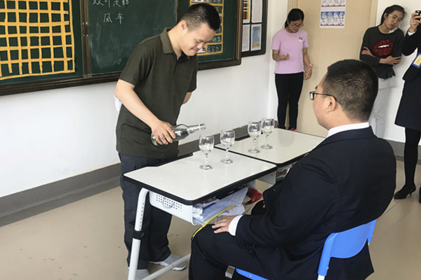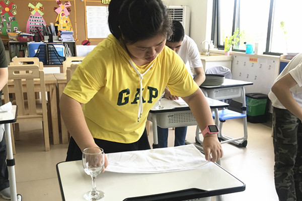 首先,测验同学们折花成果,诧楷小师傅们先是将口布依次分给仁爱学校的七名同学,四位小师傅将花型的名称写在黑板上,依次对七名同学进行测试,冰玉水仙、马蹄莲、枫叶飒爽、双叶茨菇,仁爱学校同学们标准地手法让诧楷同学们连连称赞。接着,又进行了倒酒水测验,小师傅们带领7同学排成一队,依次进行倒酒水测试,小师傅们对每一位同学的动作都给予适当的优化,看着仁爱同学们紧握酒瓶的双手,专注的神情,诧楷小师傅们很是欣慰与欣喜。随后,诧楷小师傅们对七名同学的测试结果进行点评,夸赞的话语落在每位同学的身上,仁爱学校中职班学生坚忍不拔的学习品质得到了充分的肯定。