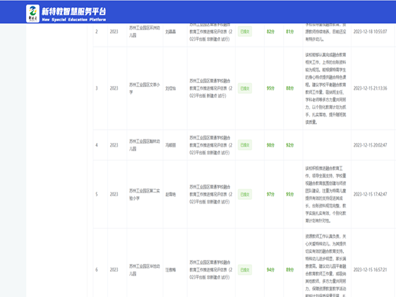 12月15日,苏州工业园区教育督导室、苏州工业园区特教指导中心组织特教、心理、教研等领域专家,对57所普通学校、幼儿园资源中心上传在新特教智慧服务平台的各项档案资料进行线上查看,考核打分。本次台账资料的考核成绩作为评选片区资源中心的重要依据。