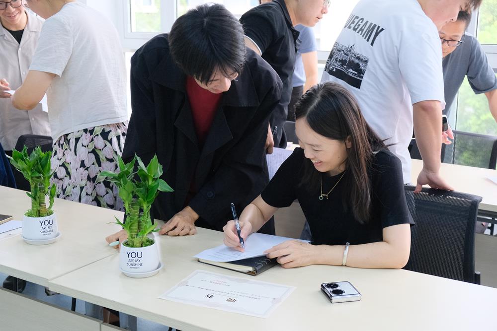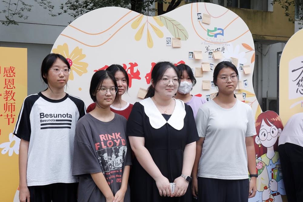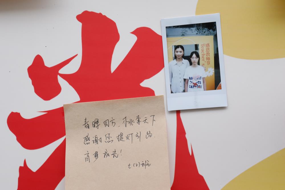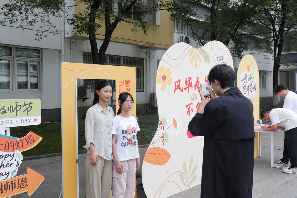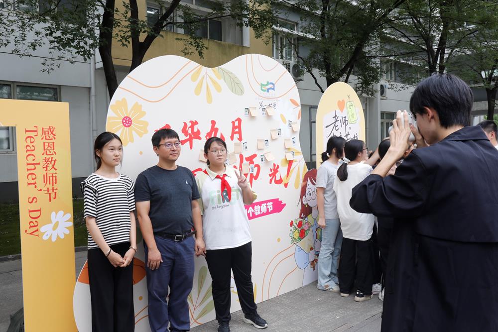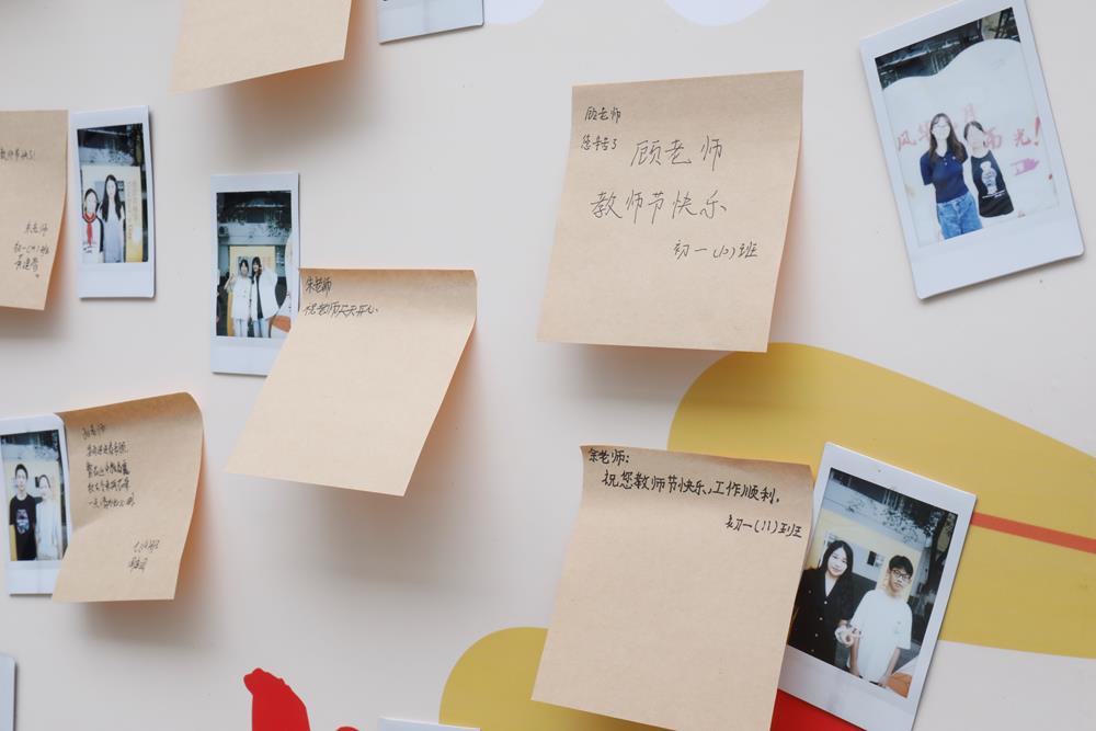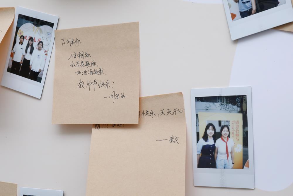 “拍立得合影+寄语”活动吸引了众多师生参与。老师们与学生们一起在镜头前绽放笑容,拍下了一张张充满温度的合照。孩子们在相纸空白处认真写下对新学期的期待、对老师的祝福……每一张悬挂于中庭展板的照片,都是这个节日最动人的风景。