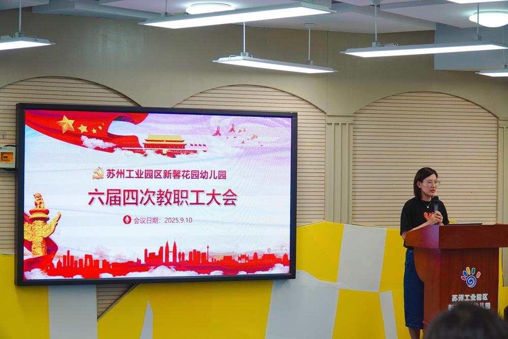 为深入贯彻党的教育方针,持续推进幼儿园民主管理进程,凝聚全体教职工智慧与力量,共绘园所发展蓝图,2025年9月10日下午,苏州工业园区新馨花园幼儿园六届四次教职工大会在庄严的国歌声中隆重召开。