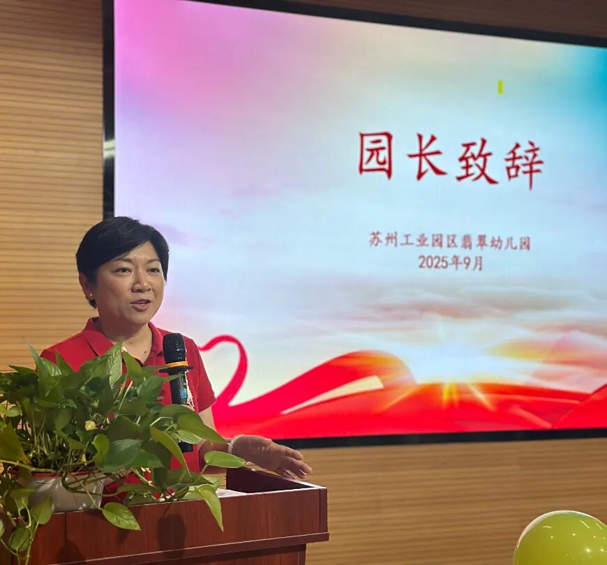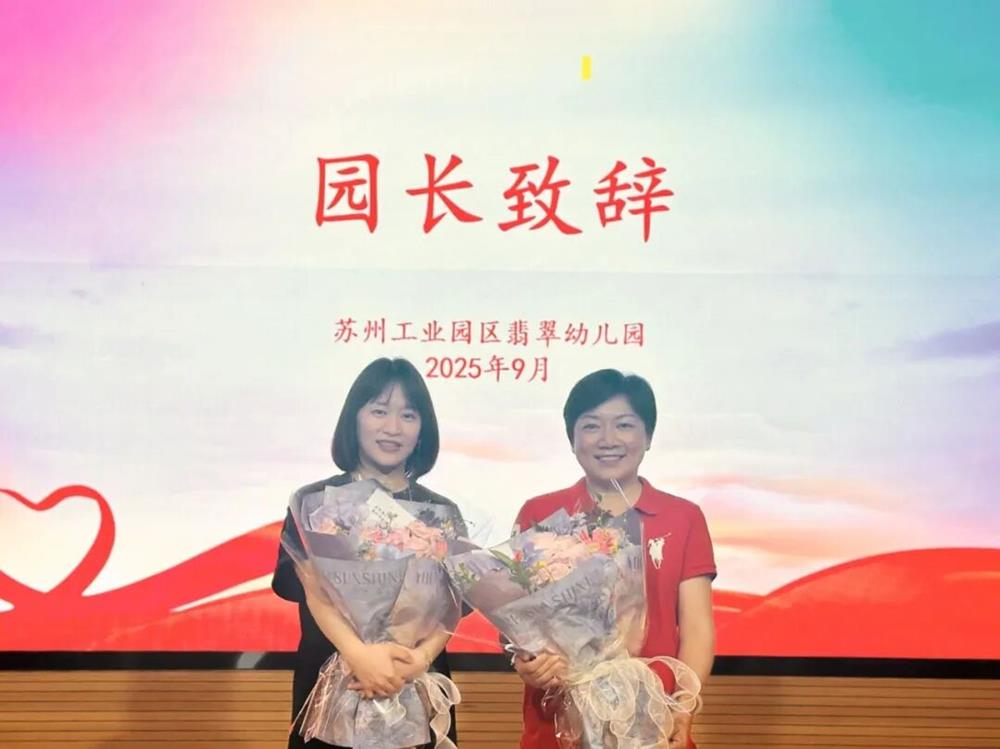 翡翠幼儿园园长许娟与副园长诸韫登台致辞,她们共同感念王晓华、吴念的深耕与付出为园所筑牢坚实根基,表态未来将秉持 “以幼儿为本” 的教育理念,传承园所优良传统,积极探索创新教育模式,与全体教职工携手推动园所发展、守护幼儿成长。致辞结束后,教师代表为许娟、诸韫献上鲜花,以简约而真挚的仪式传递全园教职工的欢迎之意。