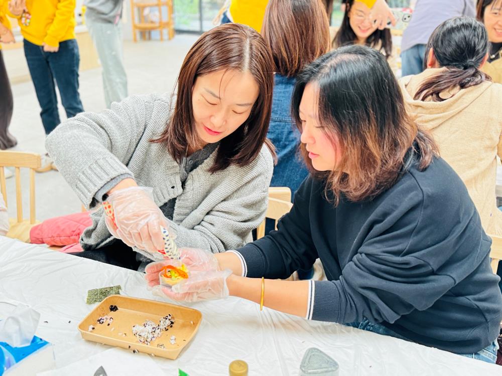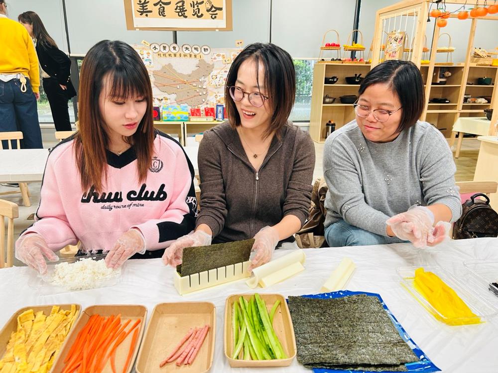 随后,家委们在美食家工作室,共同参与“自制美味寿司卷”活动。大家在亲手制作的过程中,不仅体会到膳食搭配的乐趣,也更加理解了幼儿餐食“营养均衡、健康美味”的原则。活动间隙,家委们在轻松愉快的氛围中合影留念,记录下家园携手的温馨时刻。