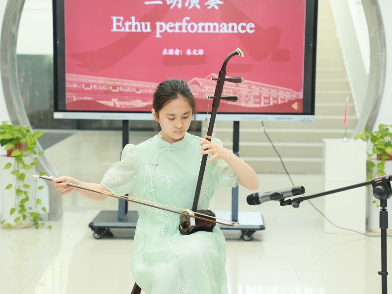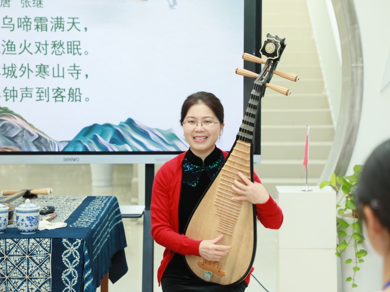 周建英老师一袭旗袍,怀抱琵琶,评弹曲调婉转悠扬,不仅让裕廊西中学师生沉醉于苏州评弹的独特魅力,更让“吴侬软语绕梁久,江南风情入梦来”的意境深深印在众人心中。