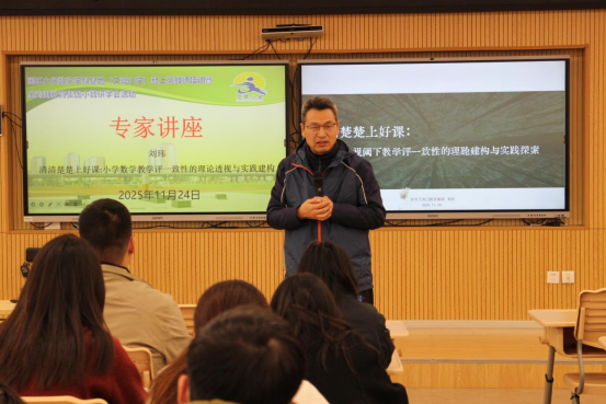 接着,刘玮校长以《清清楚楚上好课:小学数学教学评一致性的理论透视与实践构建》为主题讲座。刘校长围绕 “教学评一致性的内涵理解”“清清楚楚上好课的要义”“实践路径”“深化方向” 及 “课程内容结构化的教学价值” 五大核心展开,同时融入具身学习、连续学习、交互学习、审美学习理念,为指向真实学习历程做好导引,让学习真正发生。