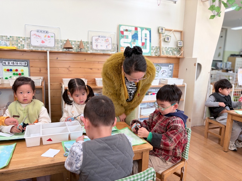传统剪纸教学往往侧重于技能训练,限制了幼儿的创意表达。在郑老师的指导下,中班年级组创设了“百宝剪坊”,提供丰富多样的纸材及工具,从光滑的卡纸到粗糙的草纸,从基础剪刀到花边剪,让材料本身成为激发创意的源泉。这一转变让幼儿从“按要求剪”迈向“为创意剪”,真正实现了工具为想象服务。教师在过程中注重启发引导,当幼儿遇到困难时,郑老师通过精准提问引发思考,让中班幼儿在解决问题的过程中自主发现剪纸的规律与美感。